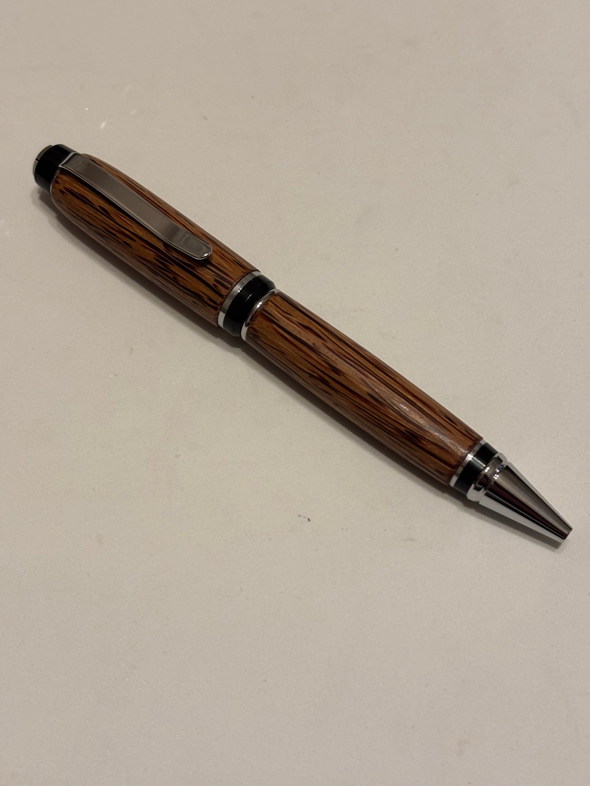 Coconut wood produces a really unusual multicoloured grain pattern. The pen, is twist action ballpoint, option of black or blue ink with chrome fittings and is finished with multiple coats of lacquer for very tough long life protection, the final coats of wax on top of this give a really good deal in the hand. Impressive grain pattern makes unique gift.