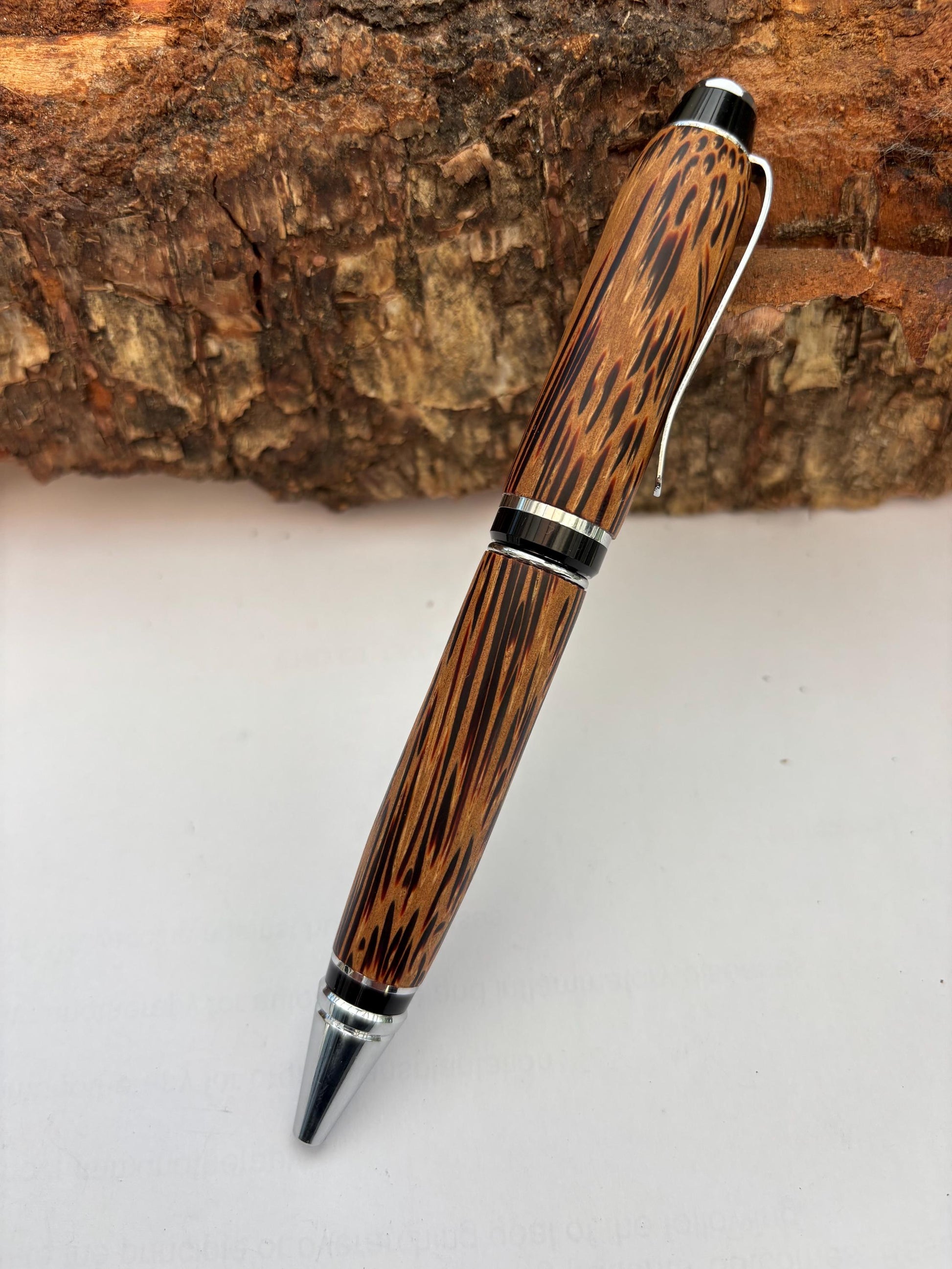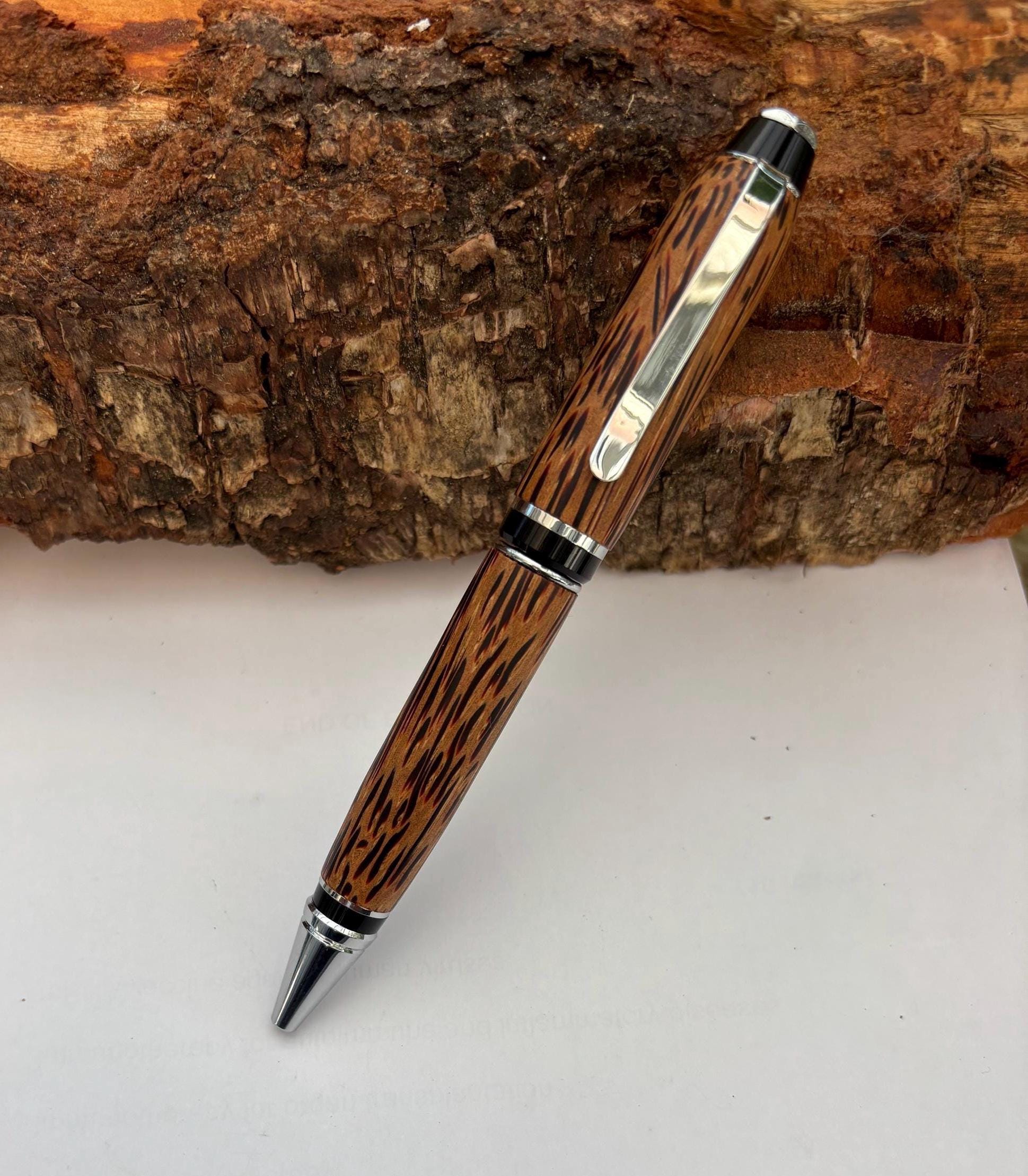 Coconut wood produces a really unusual multicoloured grain pattern. The pen, is twist action ballpoint, option of black or blue ink with chrome fittings and is finished with multiple coats of lacquer for very tough long life protection, the final coats of wax on top of this give a really good deal in the hand. Impressive grain pattern makes unique gift.